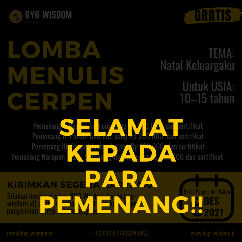 Keputusan pemenang dalam lomba tidak dapat diganggu gugat. Hasil keputusan hanya diumumkan dalam situs BYG Wisdom (www.byg-wisdom.id) dan pemenang telah dihubungi oleh BYG Wisdom melalui email (info@byg-wisdom.id) dan/atau telepon melalui nomor +6281287638604 (hanya melalui nomor tersebut).